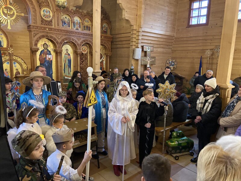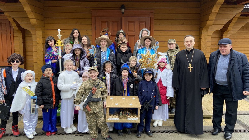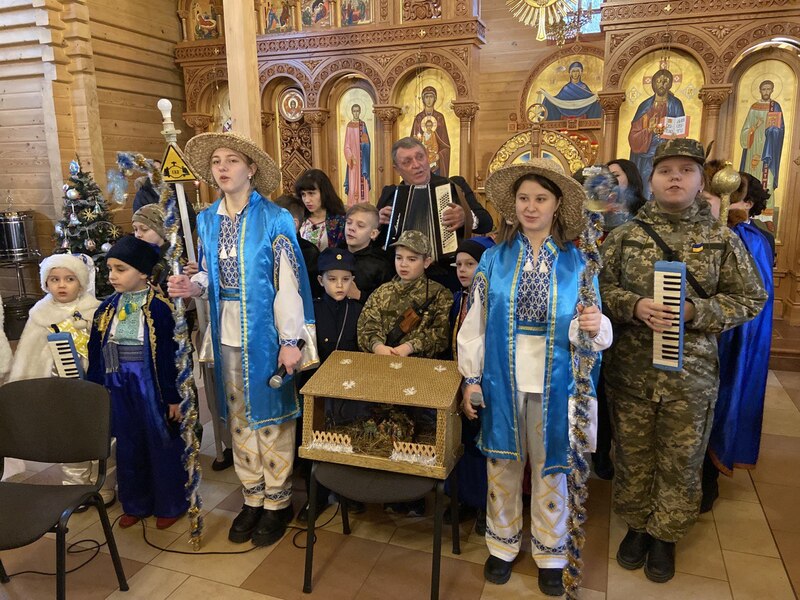 "Добрий вечір, панове господарі, прийміть нас до хати з далекої далі. Почуйте звістку і правду велику, що Бог народився – усіх Утішитель. Покликав до себе у Царство Небесне. Хто вірить у нього той знову воскресне. Подав Він народам потіху й надію, щоб кожен міг втілити свою мрію. І ми принесли вам Божеє слово і ним поділитися нині готові. За звичаєм добрим якого навчились від наших дідів і батьків з України. Тож хочем, щоб слово теє почули і стали добрішими люди усюди, щоб війна скінчилась, зло щоб пропало, спокій настав у нашій державі. Тож слухайте правду про тую Дитину, що мовлять вам діти – ми з України", – такими словами у сьогоднішню неділю, 29 грудня 2023 р. Б., вітали наших вірних учасники ансамблю "Ходаки" на чолі з керівником Михайлом Полюгою.
