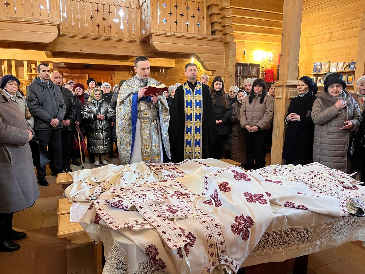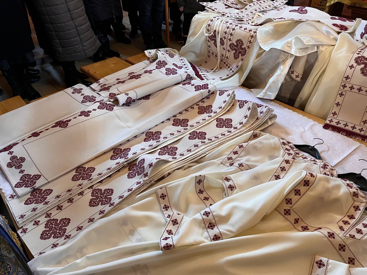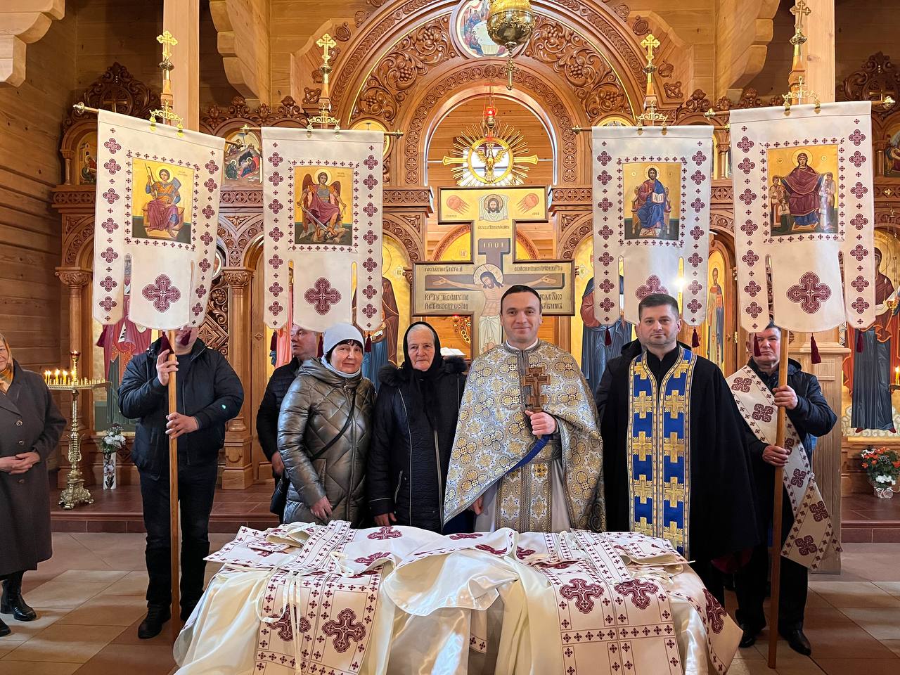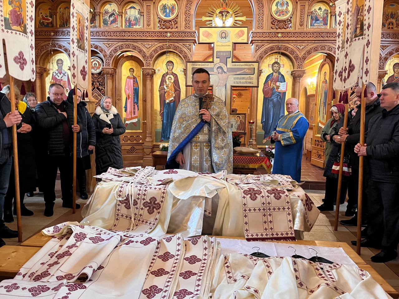 Отець Олег розповів, що комплект оздоби налічує велику кількість покривал, 2 комплекти риз для священиків, паламаря та прислуги, а також хоругви. Над ними довелося найбільше попрацювати: вони містять написані на полотні ікони Христа Вседержителя, Покрови Пресвятої Богородиці, Святого Архистратига Михаїла та святого великомученика Димитрія.